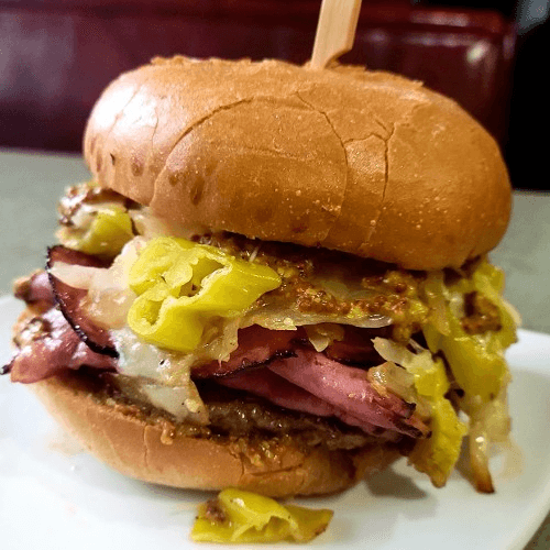 Brown sugar bacon, lettuce, onion, pickles, and pepperoncinis, cheddar cheese, BBQ sauce, and Hangry sauce (mustard based)