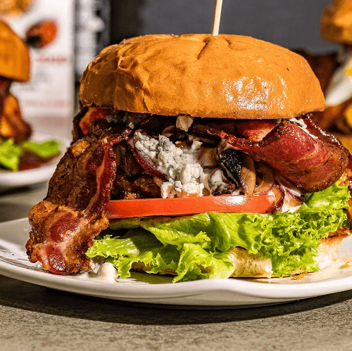 Bacon, sauteed portobello mushrooms, grilled onions, bleu cheese crumbles, bleu cheese sauce, lettuce, and tomato.
